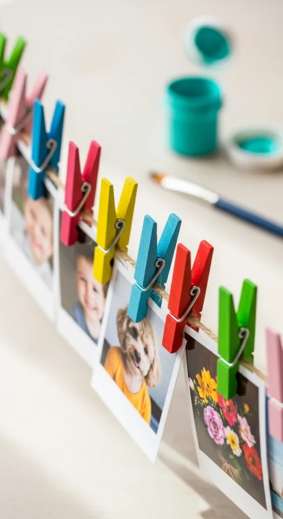 Paint clothespins in one or two colors. Let dry. Clip photos onto twine for quick wall decor.