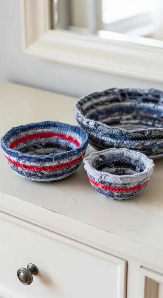 Fabric bowls are perfect for scraps and old tees. Cut a t-shirt into long strips. Twist or braid two or three strips together for a thicker “rope.”