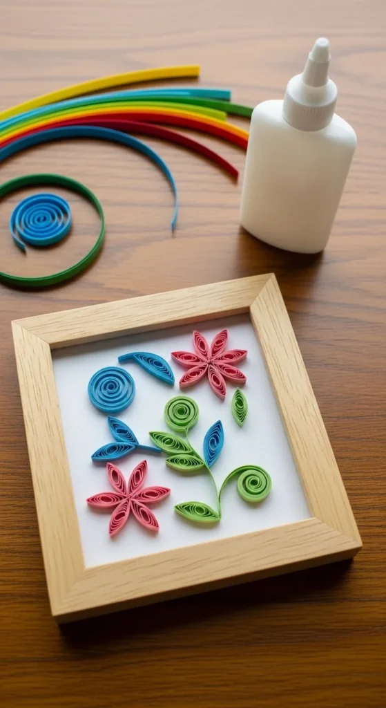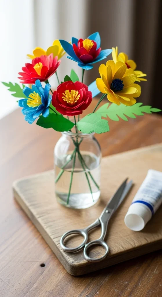 Paper flowers give a big visual reward fast. Use colored paper or scrapbook paper. Cut petal shapes and wrap them around a tight paper center.