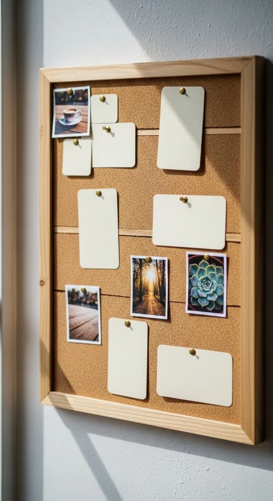 Frame a small cork board with scrap strips. Pin photos and blank cards.