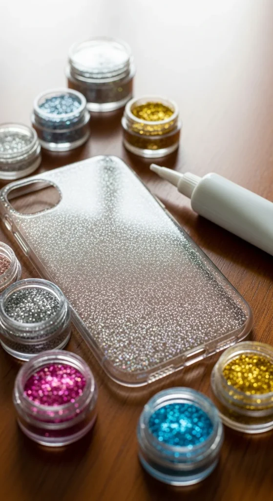 Use a cheap clear case. Brush a thin layer of clear glue inside the case and sprinkle glitter lightly. Tap off extra glitter.
