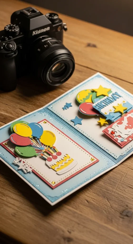 Fold layered cardstock panels that open outward. Add photos and notes.