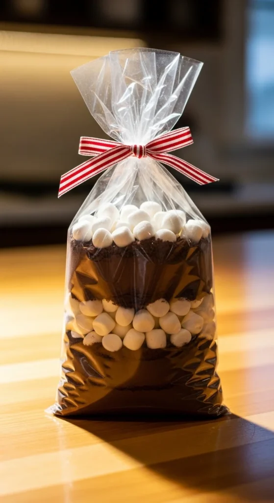 Layer cocoa mix and marshmallows in a bag. Tie neatly.