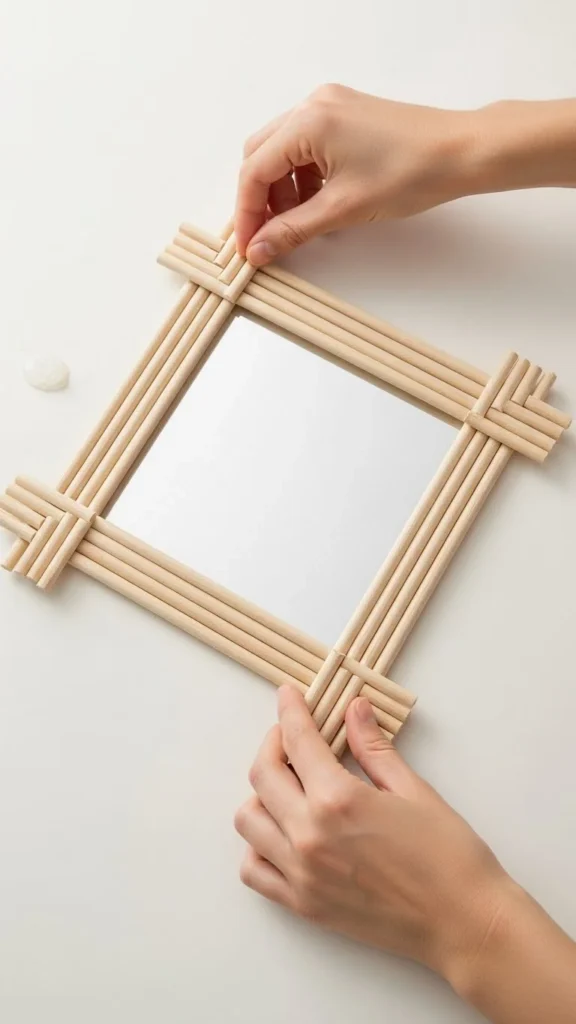 Measure your mirror, cut your materials evenly, and attach them using strong adhesive or a glue gun.