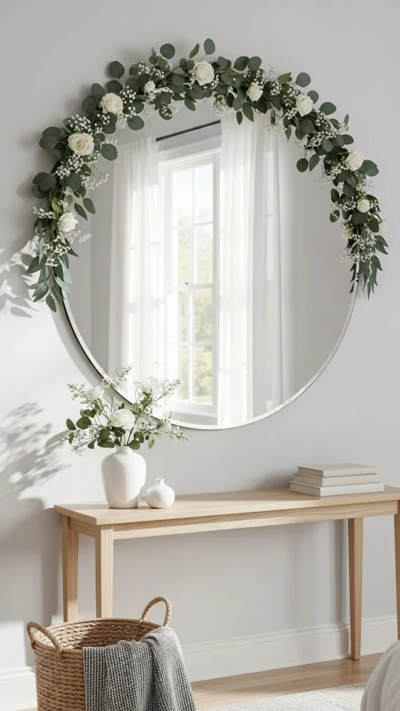 Adding greenery instantly softens a mirror and brings life to the space. Faux options are affordable, long-lasting, and easy to rearrange.