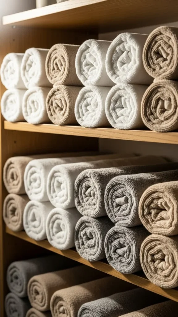 If towels look mismatched, group similar tones together. Consistency matters more than buying new items.