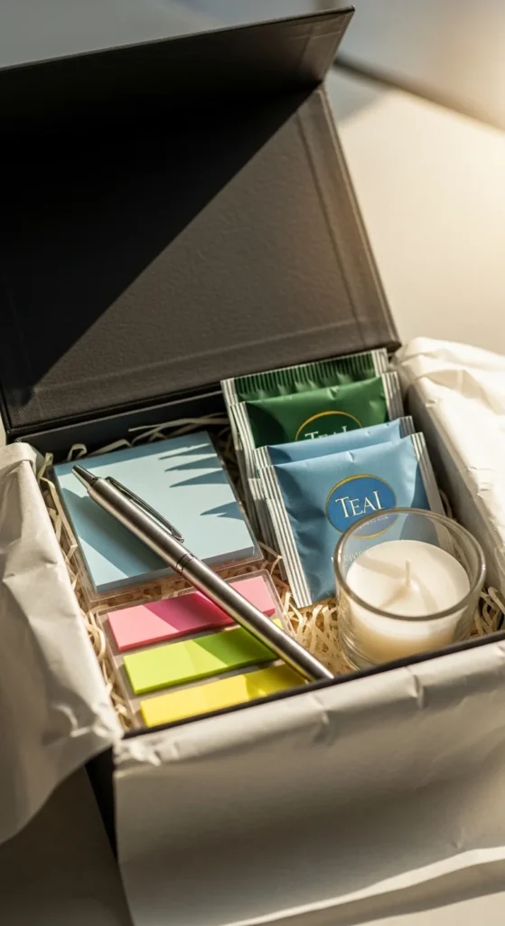 Build a small box with items that make their day smoother: a nice pen, sticky notes, a mini hand cream, and a tea sachet. Add a note that says “For your next busy day.”
