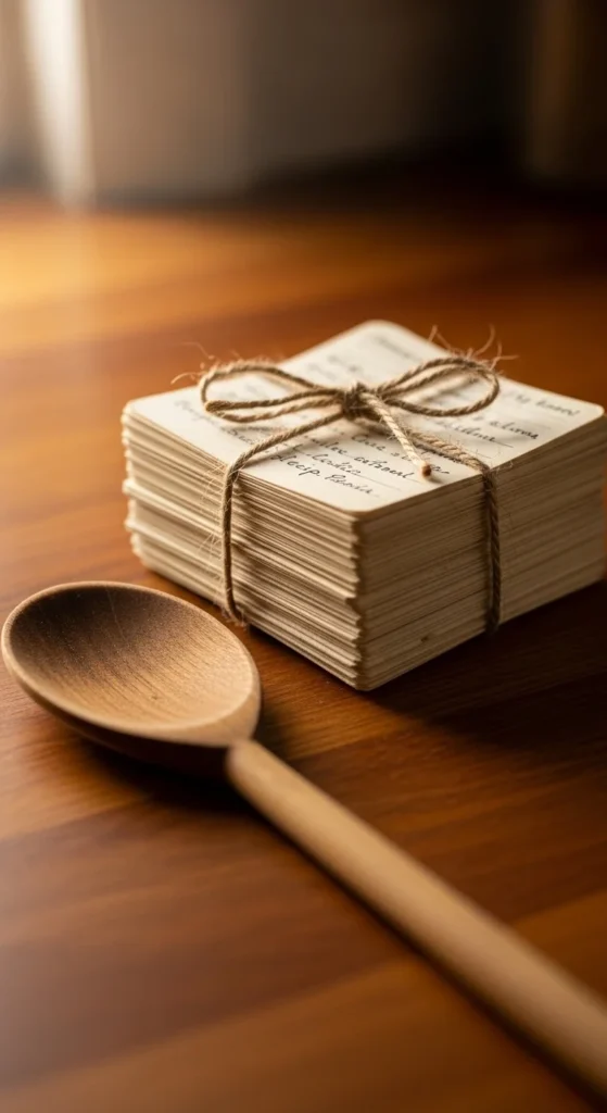 Write 5–8 recipe cards of simple favorites: pasta, tea, dessert, or a snack. Tie them together with twine. If you have printed photos of the dishes, add one to the top card.