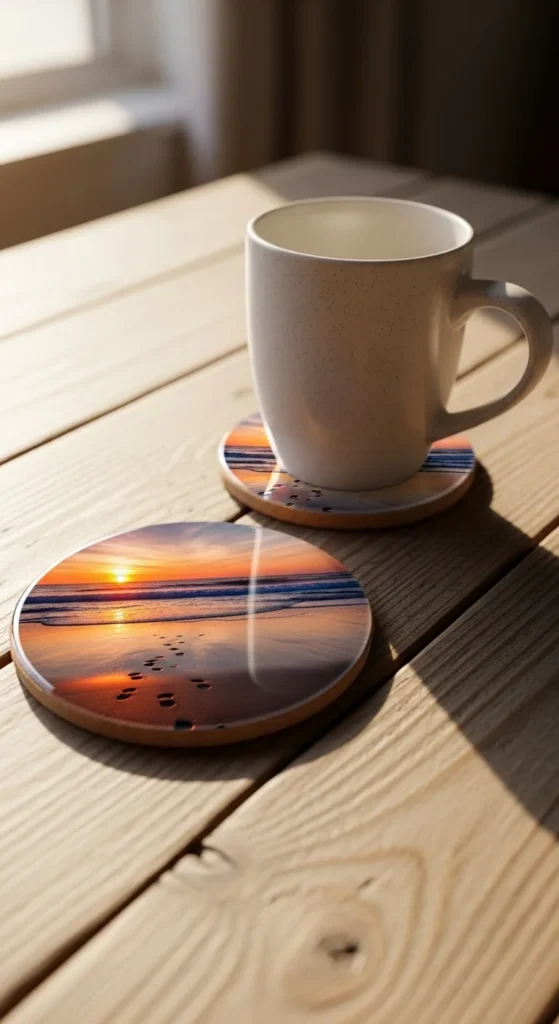 Glue printed photos onto cork coasters and seal with clear glue or mod podge. If you don’t have sealant, use clear tape carefully and trim edges cleanly.