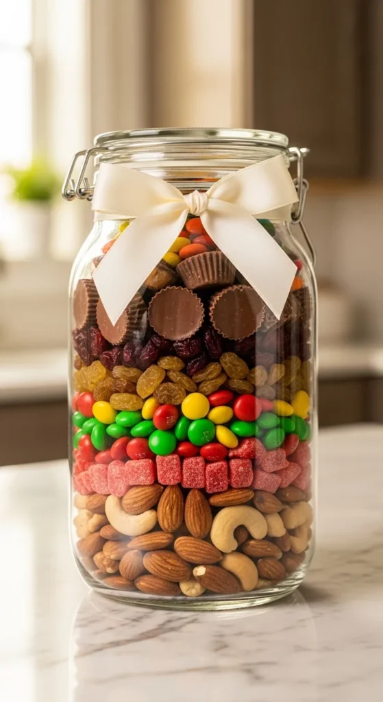 Pick snacks they love and layer them in a clear jar. The key is variety and neat layers. Think nuts, candy, cookies, or dried fruit—whatever fits their taste. Add a quick tag with a personal line like “Your favorite bites for your best day.”