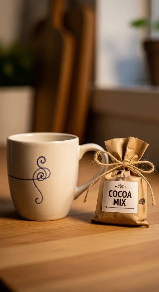 Decorate a plain mug with paint pens using simple dots, lines, or initials. Pair it with a small cocoa packet you mix yourself (cocoa powder + sugar) in a little bag. Tie it with twine.