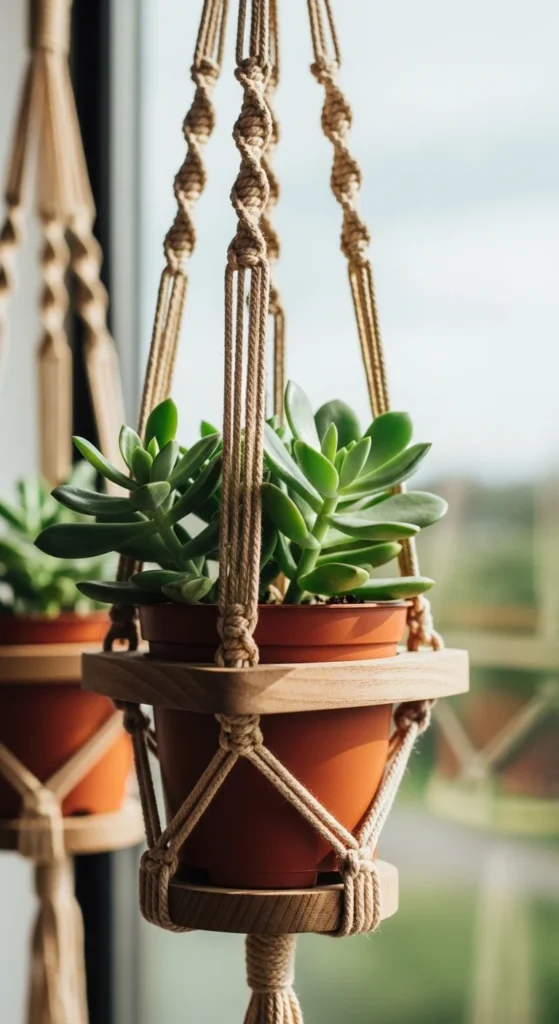 Plant holders add life to a space. Use a simple frame or shelf design with rope or brackets.