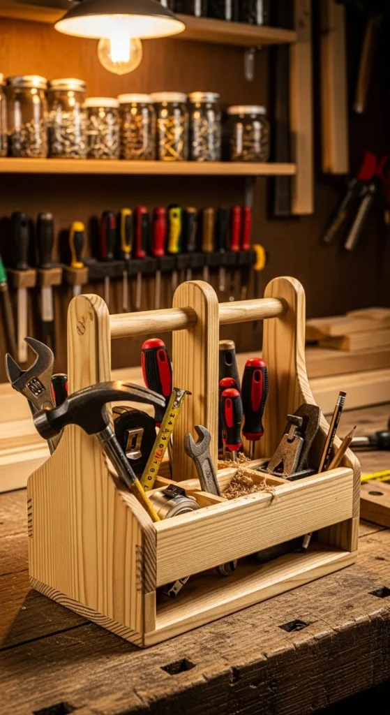 A tool caddy keeps tools organized. Build a simple box with a handle.