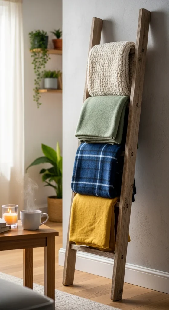 A blanket ladder adds storage without taking space. Use two long rails and evenly spaced rungs.