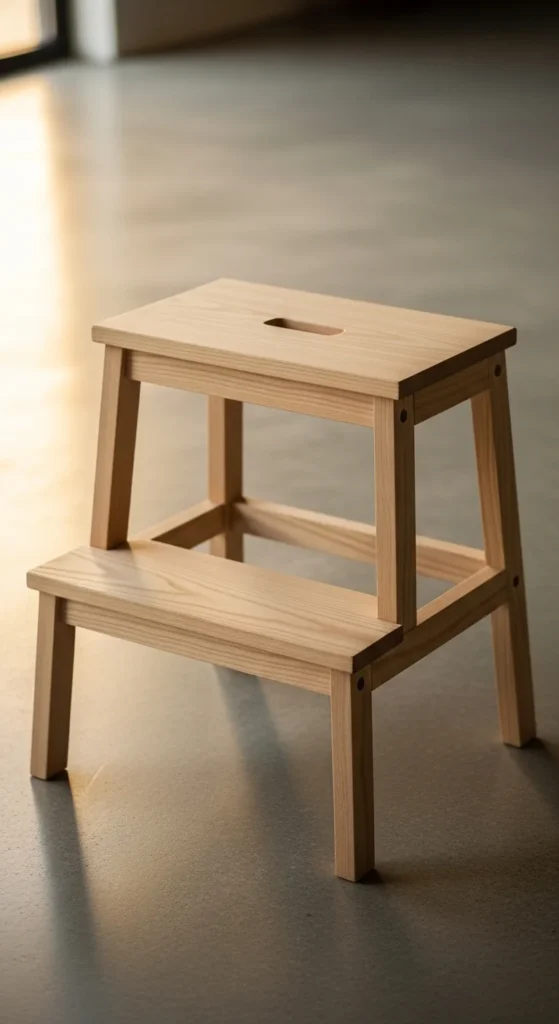 A step stool is a practical small furniture project. Use basic cuts and simple joinery like screws or pocket holes.