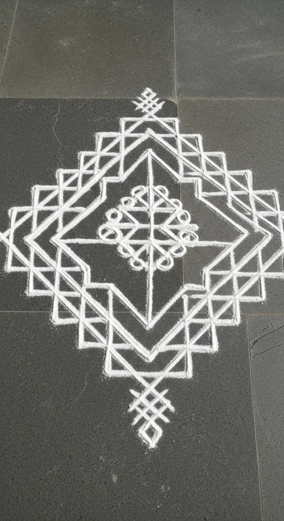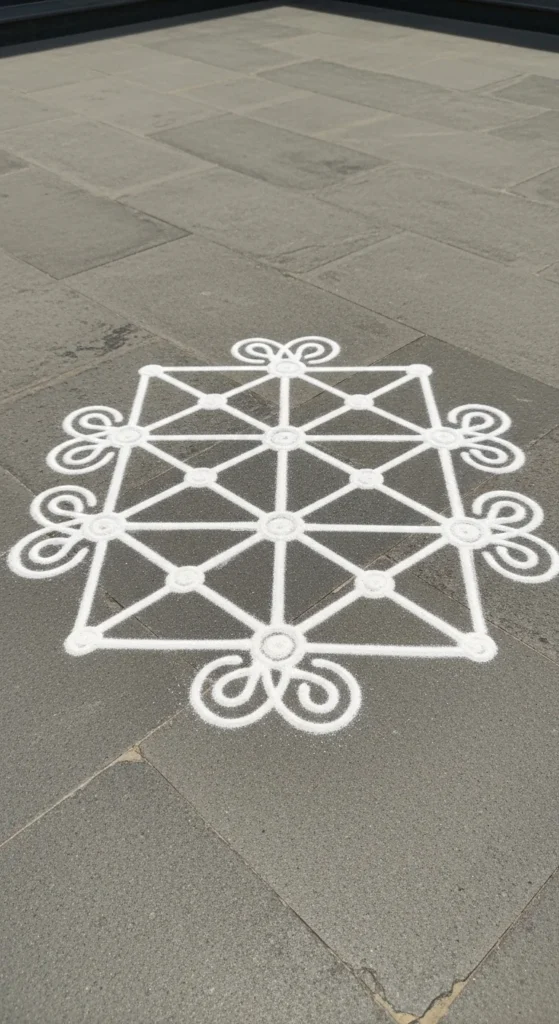 This is the easiest daily practice design. It works near pooja corners, small balconies, and tight entrances. You can finish it before your tea cools.
