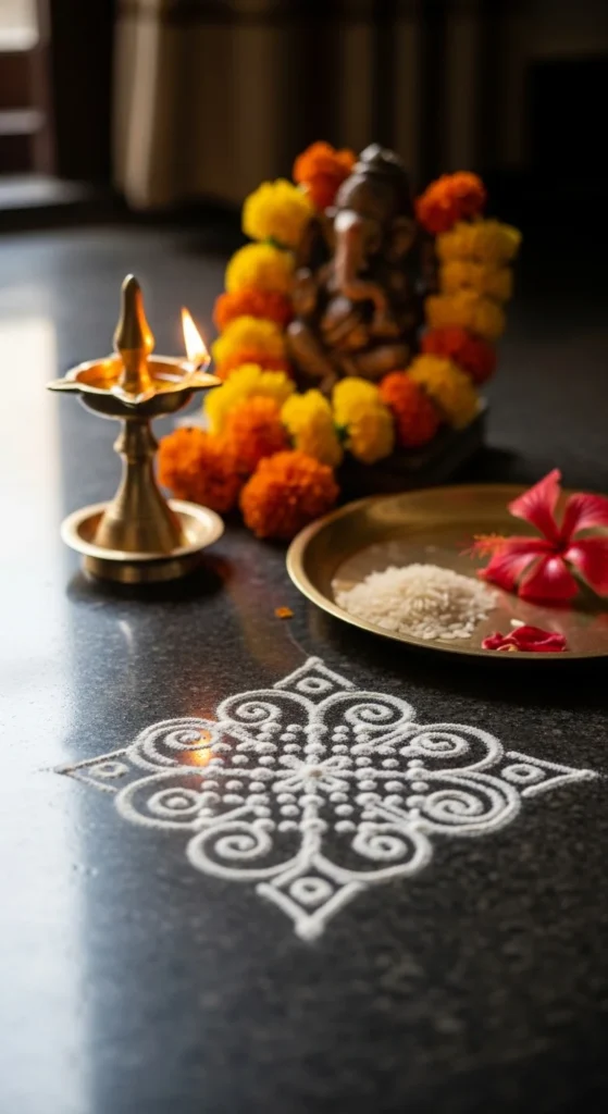 13) Tiny Corner Kolam (Pooja Shelf Spot)