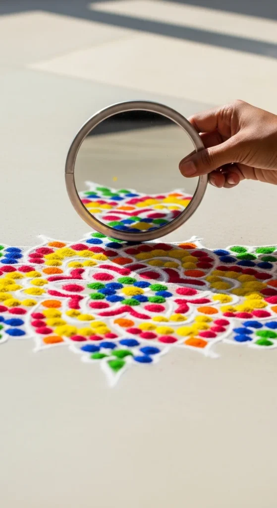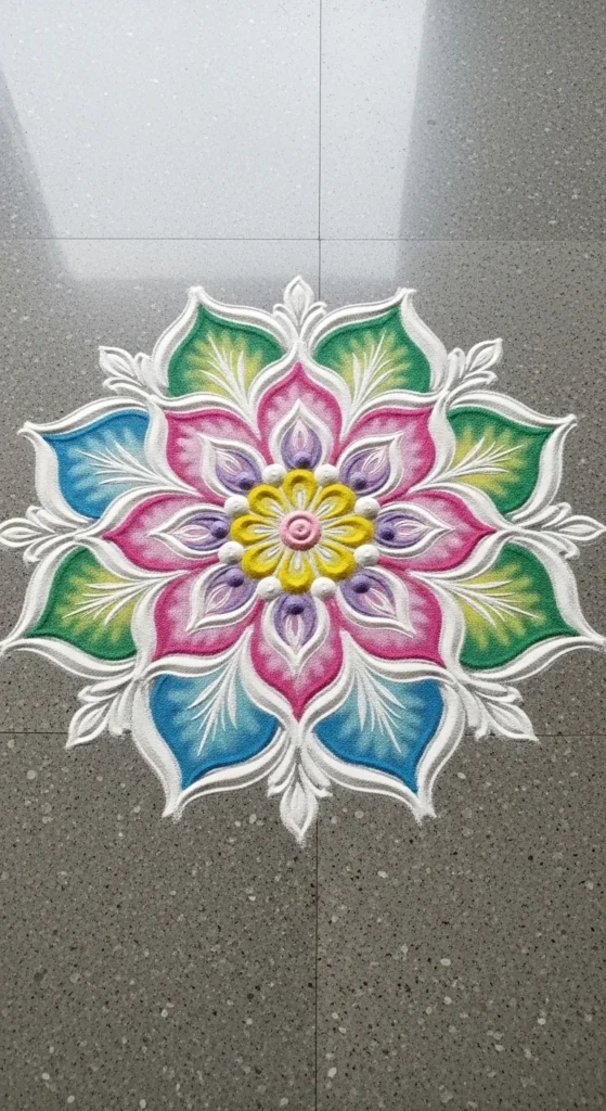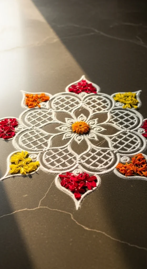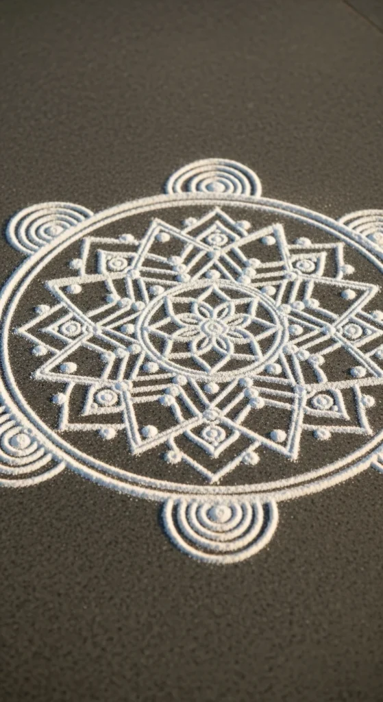 Keep the whole design white for daily routine. For festivals, add a soft colored ring around the outer frame only. That adds celebration without making it busy. If wind is a problem, lightly mist the finished kolam with water from a spray bottle. It helps the powder settle.