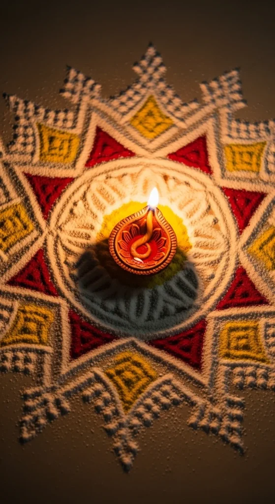 Make a simple dot circle pattern. Place a diya in the center. The diya acts like a focal point, so your outer pattern can stay simple and still look complete.