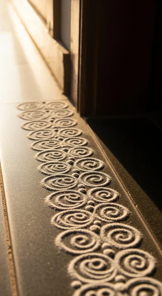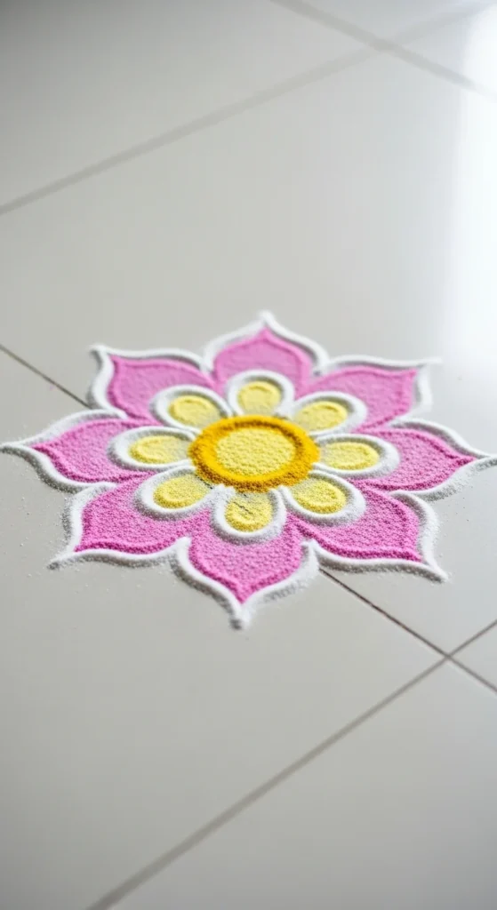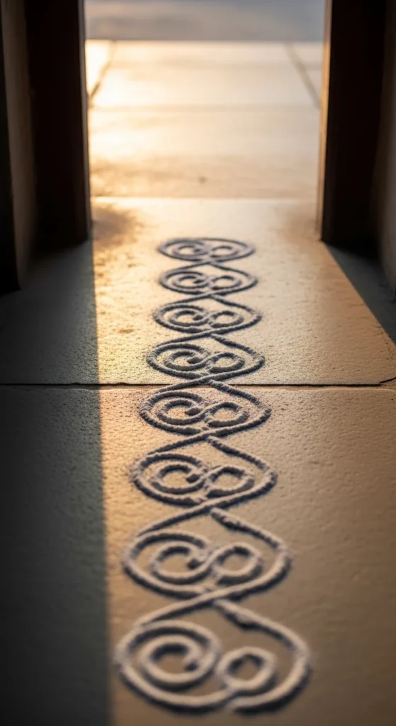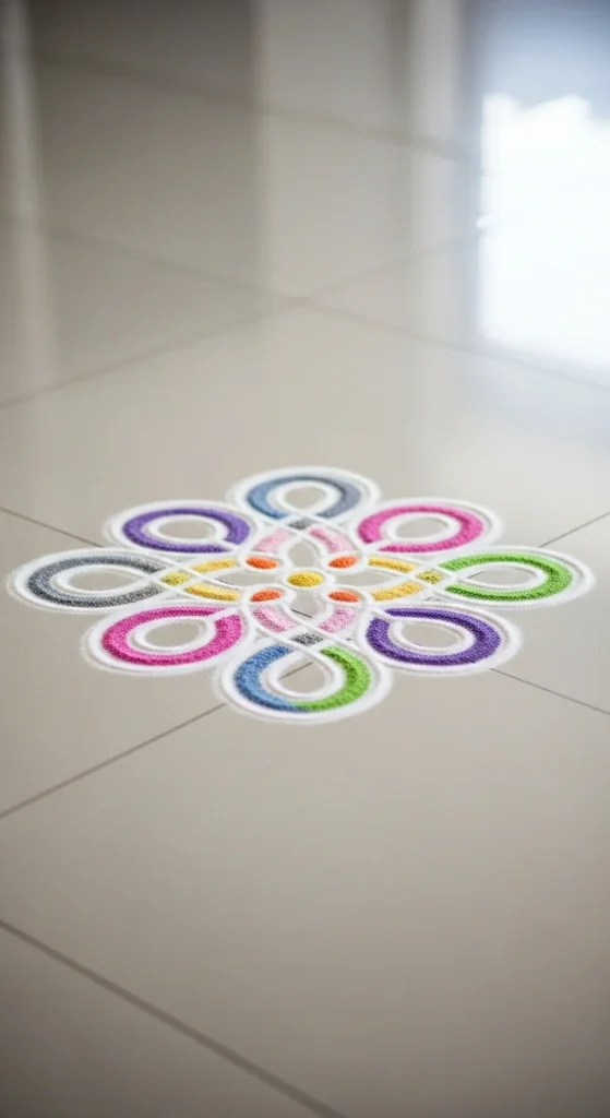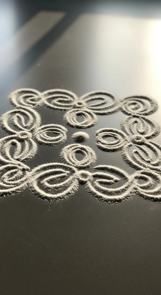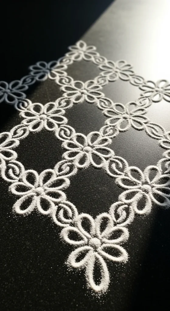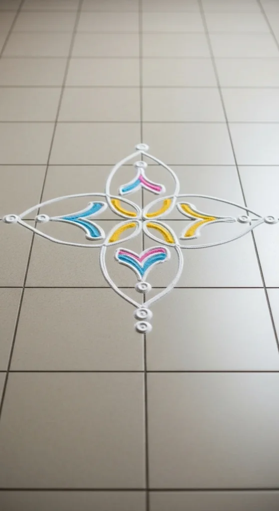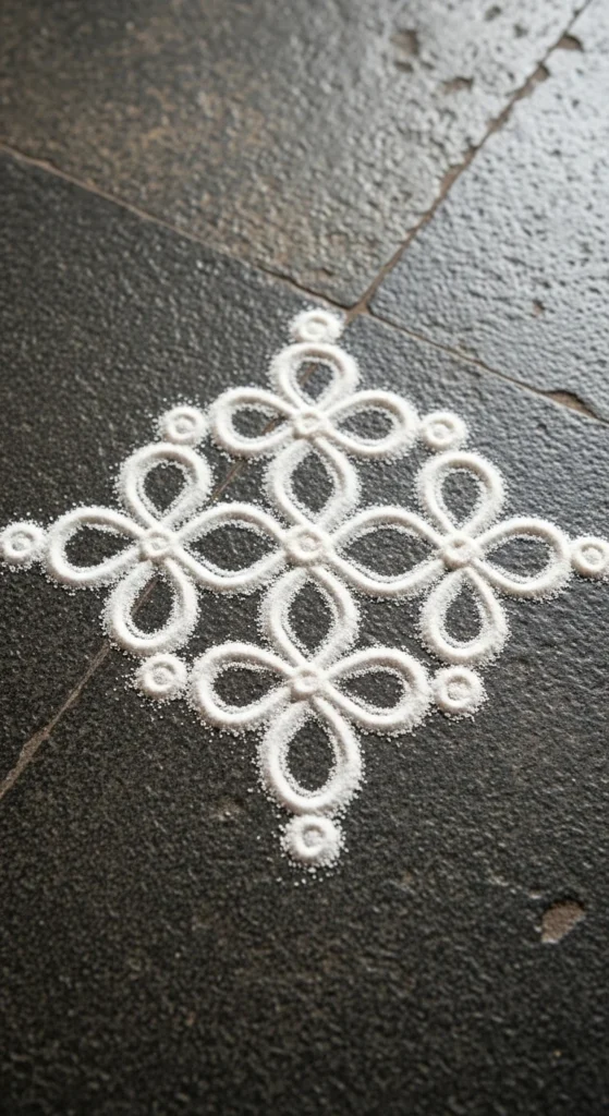 Budget tip: If rice flour is too powdery, mix it with a little semolina. It drops in a steadier line and doesn’t scatter as easily in wind. This pattern is perfect for apartment thresholds and indoor tiles.