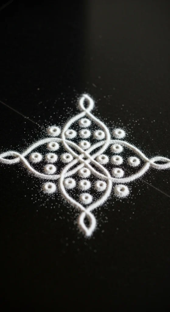 Want a neat “finished” edge? Add two tiny dots at both ends and wrap them with a small loop. That small detail makes it look like a complete pattern instead of a practice drill. Great for everyday entrances and quick festival mornings.