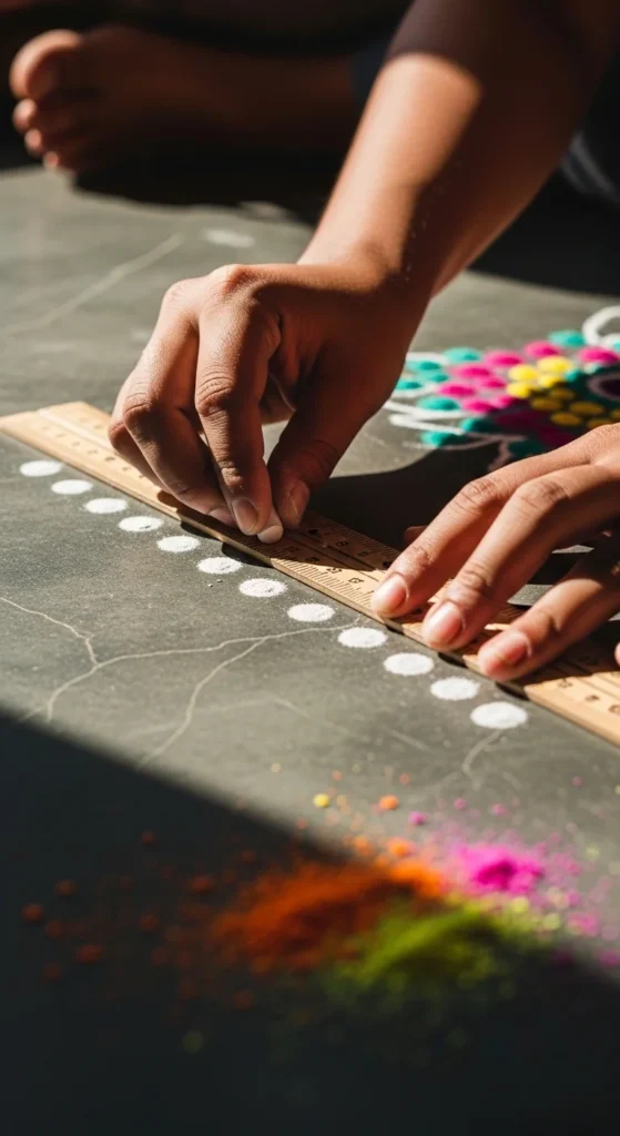 Mark dots with chalk first. Check spacing with a ruler. Then draw with flour. This setup method is the fastest way to get clean results as a beginner.