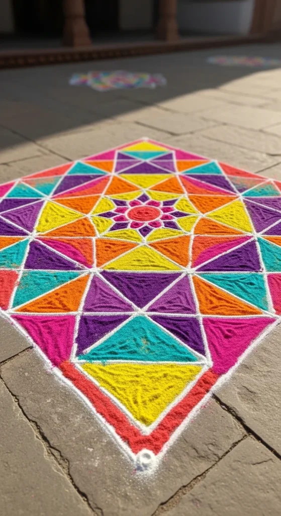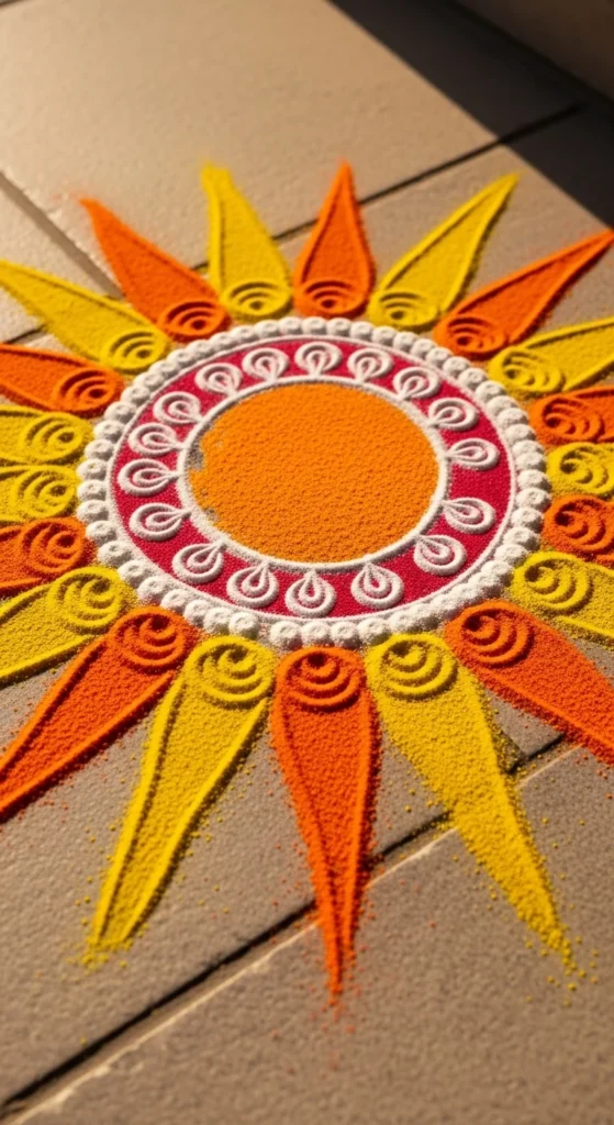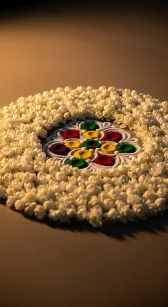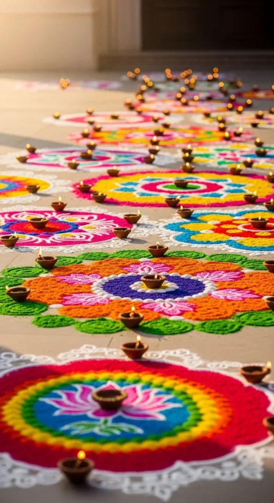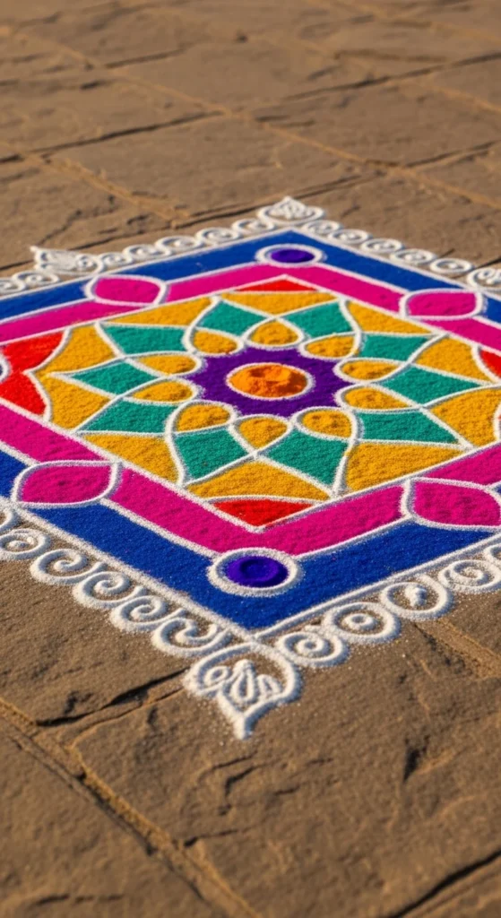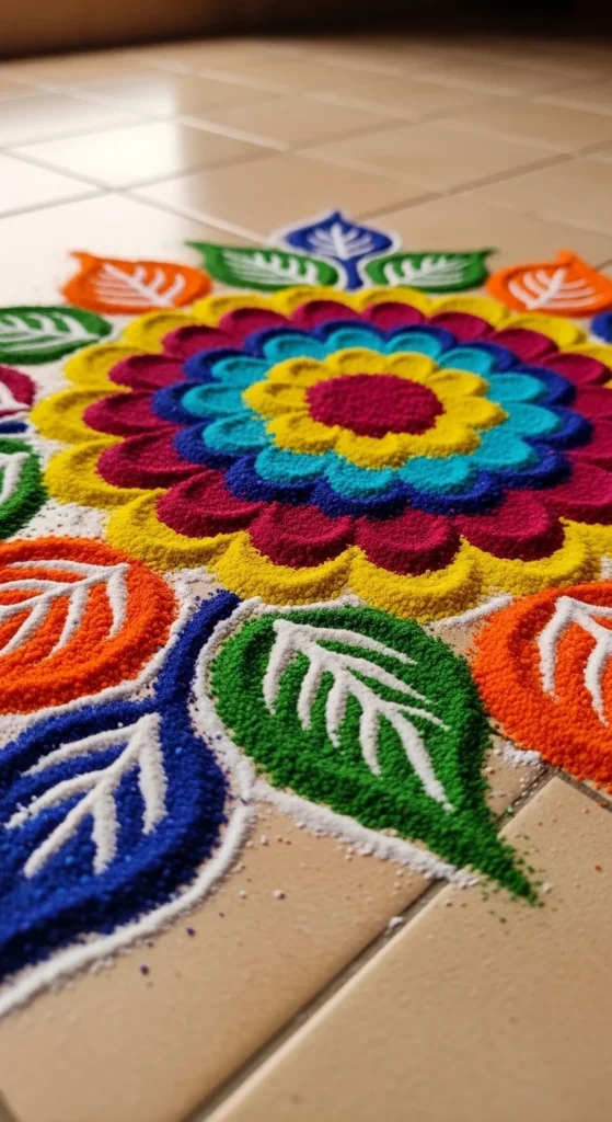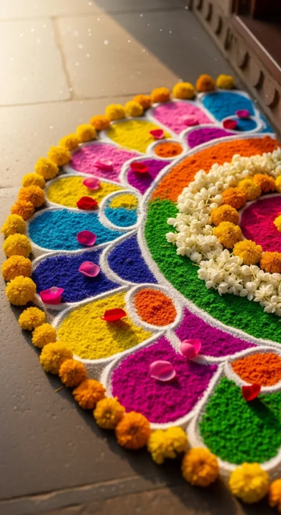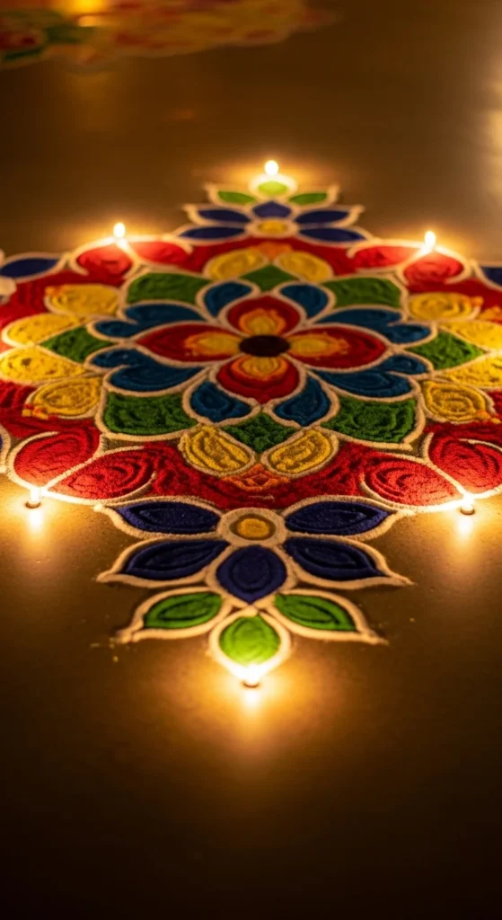 For extra charm, place a diya in the center. That small focal point makes the design feel complete.