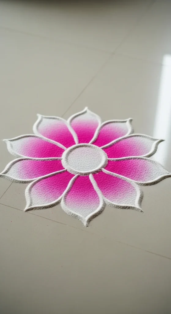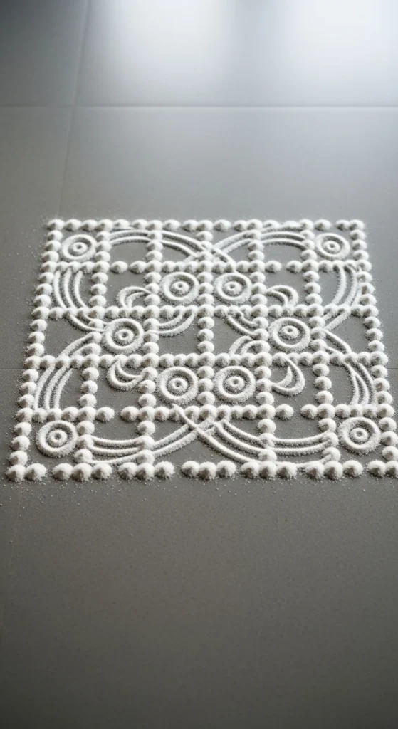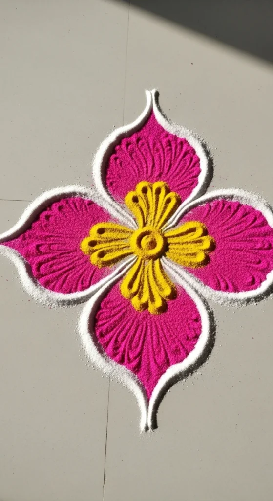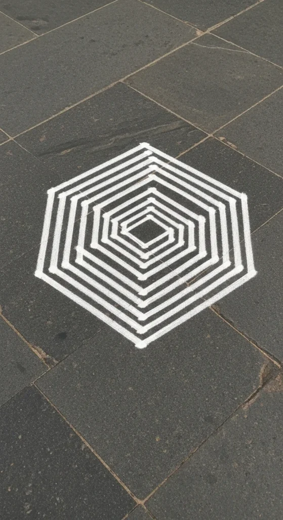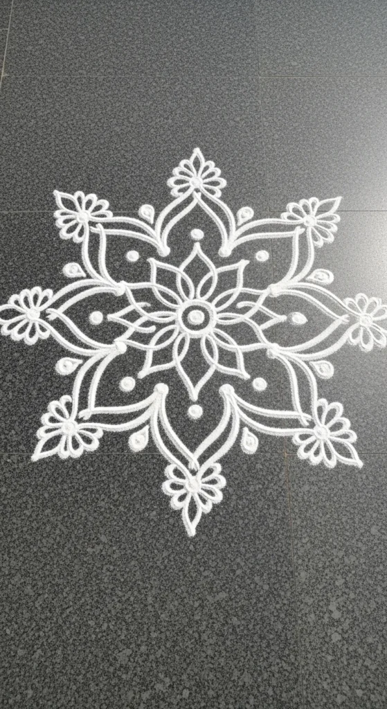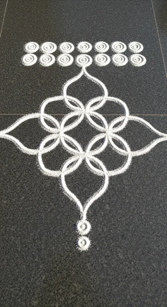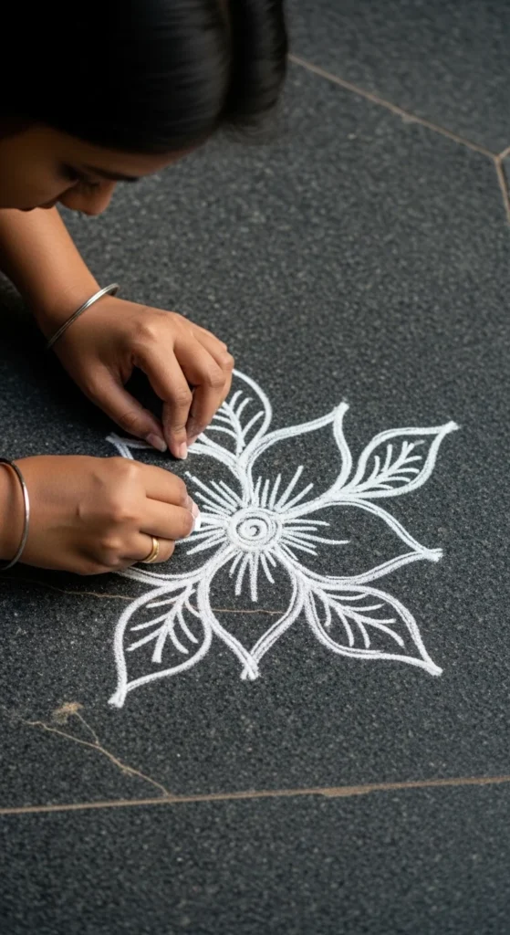 This is one of the most foolproof beginner rangoli designs because symmetry is built in. Use chalk or rice flour to place dots first. Keep equal gaps using your fingers as a rough measuring tool.