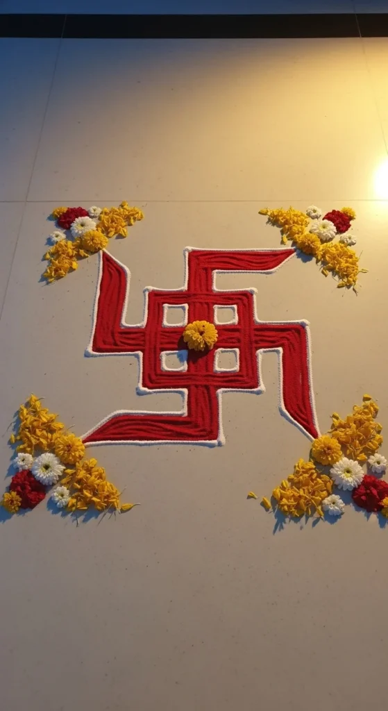 6) Simple Swastik with Floral Corners