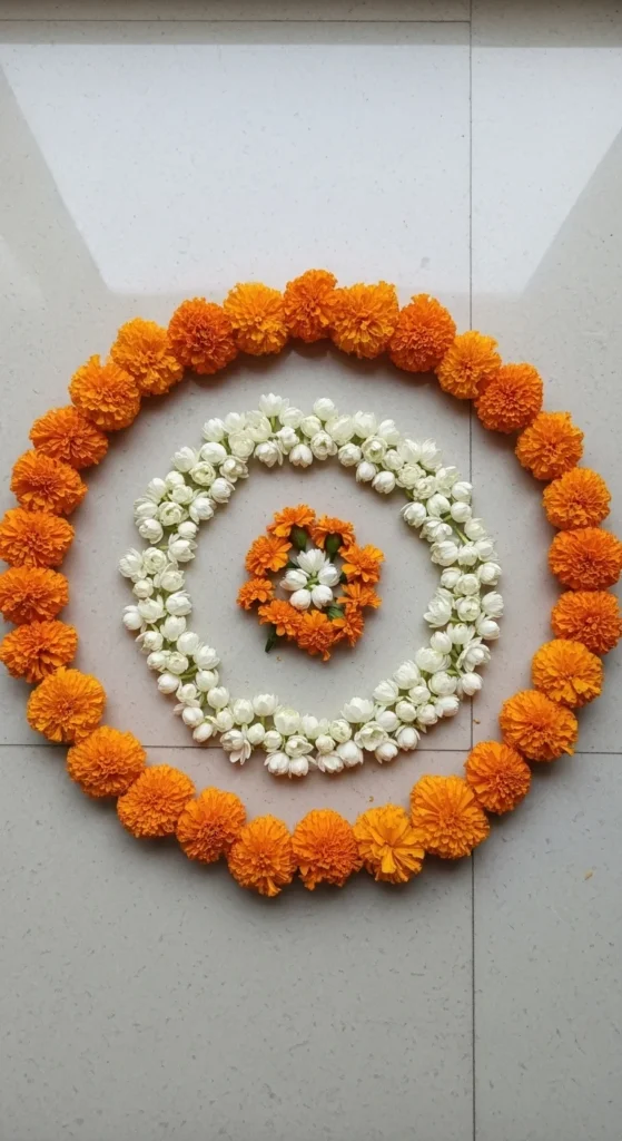 Draw a light chalk circle first. This keeps your shape neat. Fill the center with yellow marigold petals. Then add an outer ring using white jasmine.