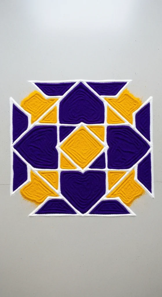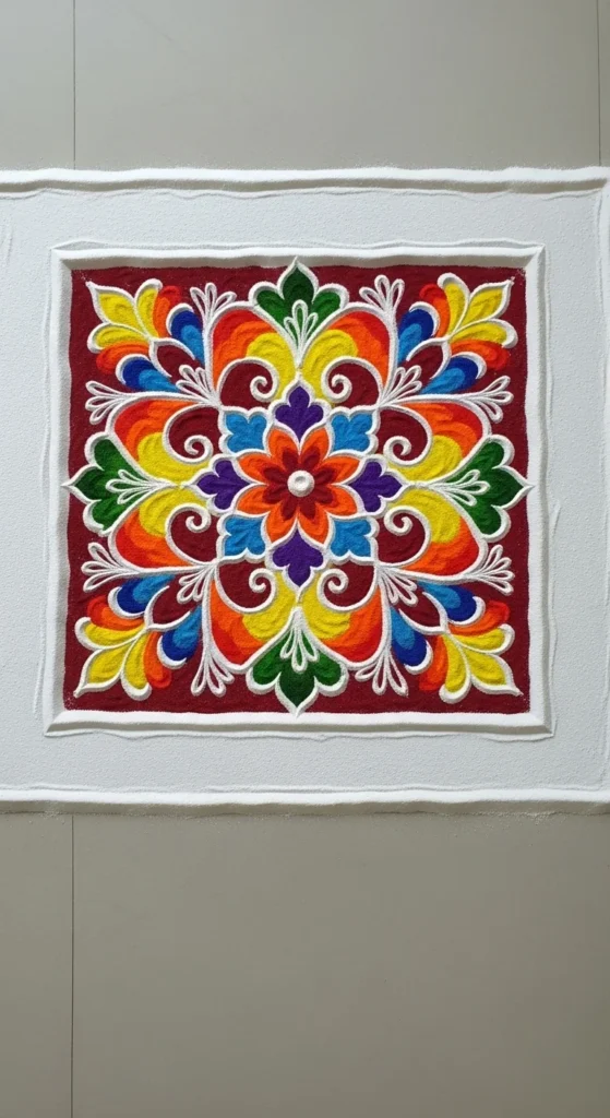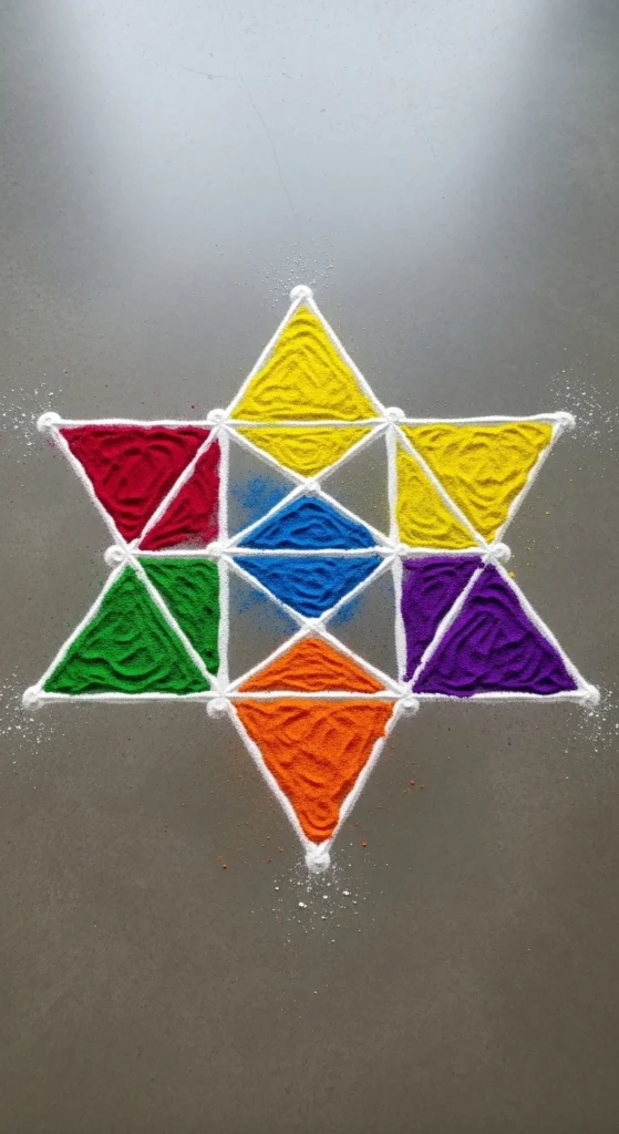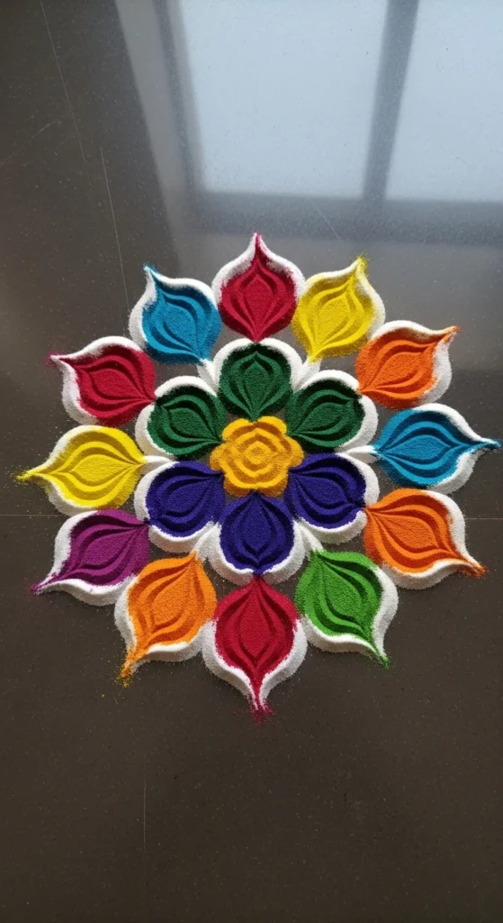 This rangoli is perfect for Diwali entrances and larger spaces while still staying beginner friendly.