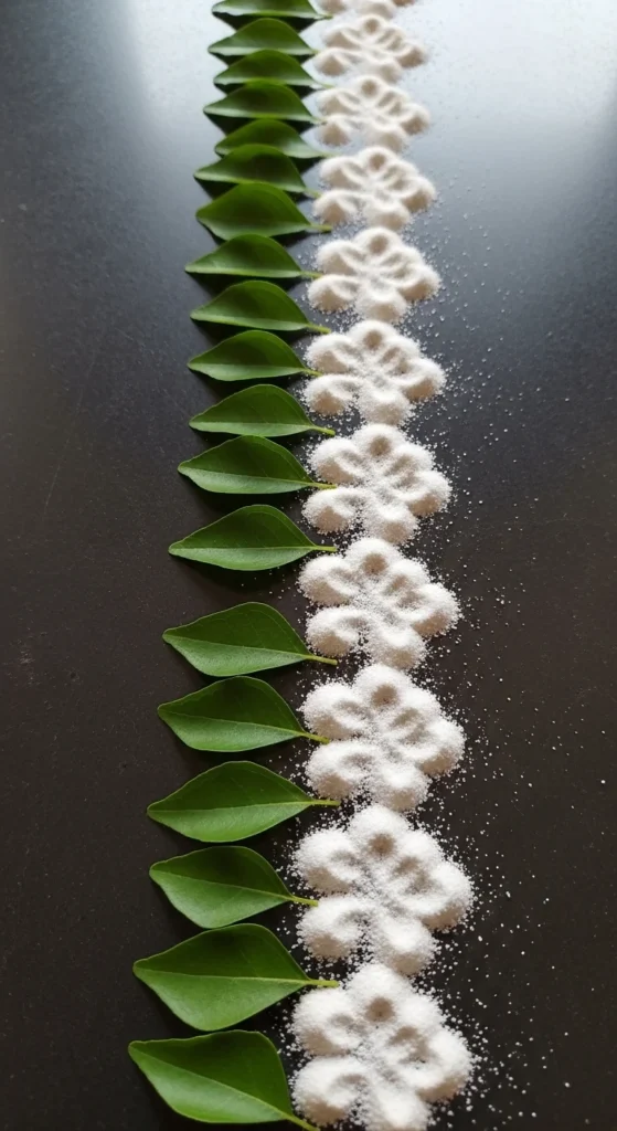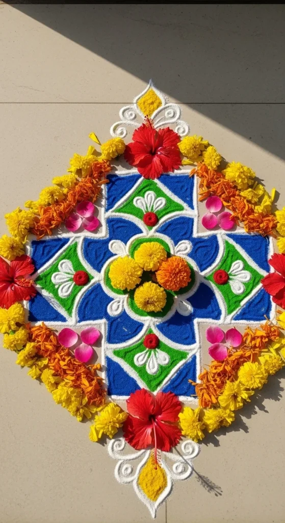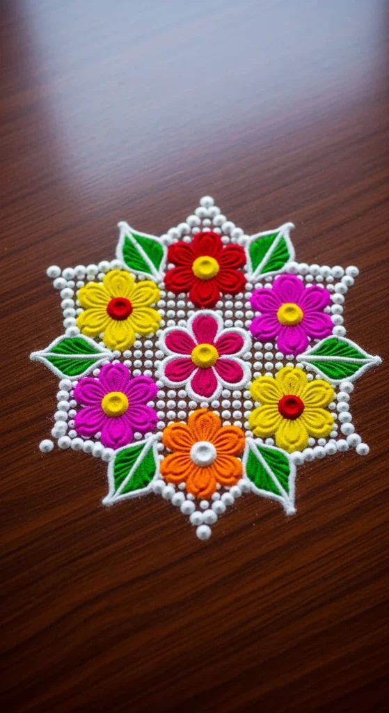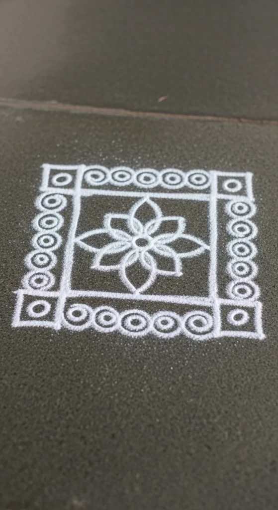 This rangoli is ideal for busy evenings when you want something pretty in under 10 minutes.