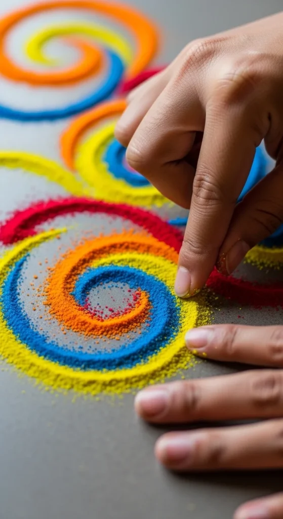 Once the spiral is drawn, decorate the gaps with small petals or colored powder dots.