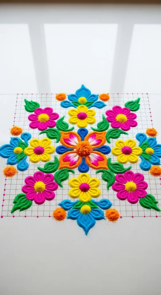 23. Easy Grid Flower Rangoli