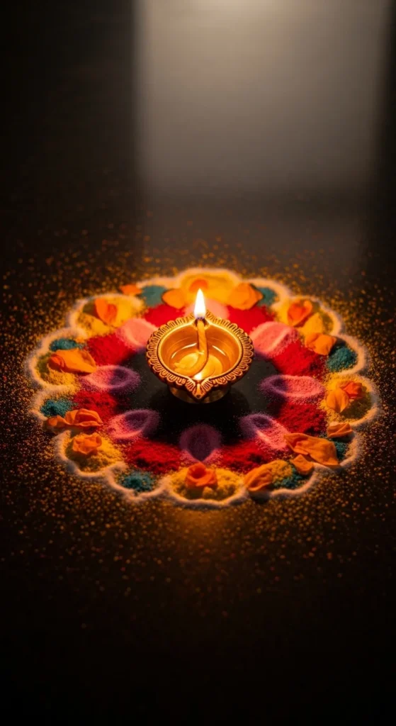 Finish by placing one diya in the center. That single step makes the rangoli look much more detailed.