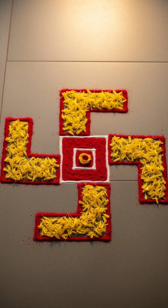 The swastik symbol is widely used in festive rangoli and is very beginner friendly.