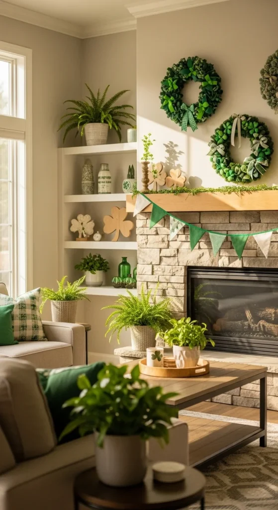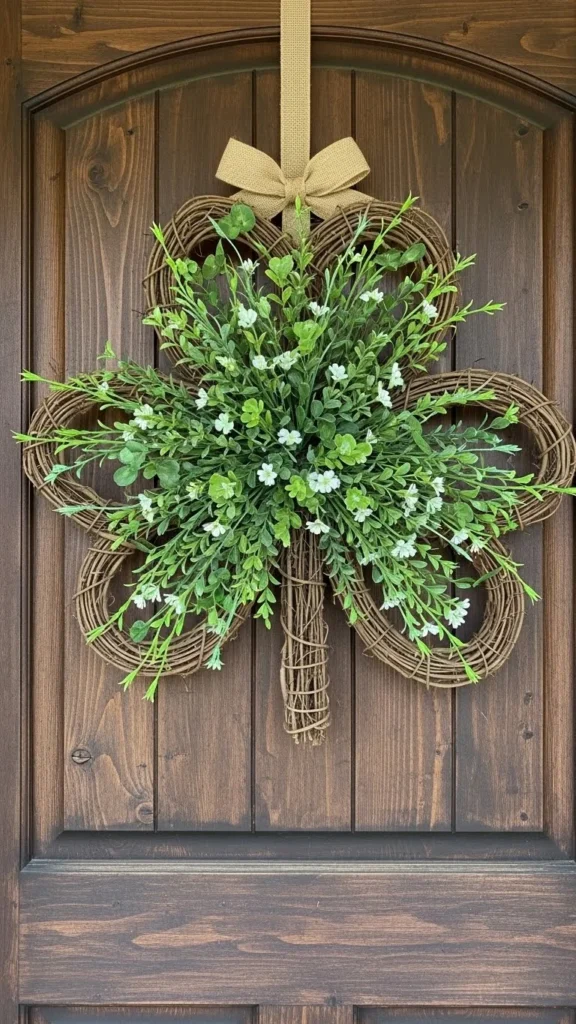 A shamrock wreath instantly sets a festive tone at your entry. Use faux greenery, twine, or flexible branches to form the shape. Attach pieces using floral wire or hot glue. Keep the design loose rather than packed.