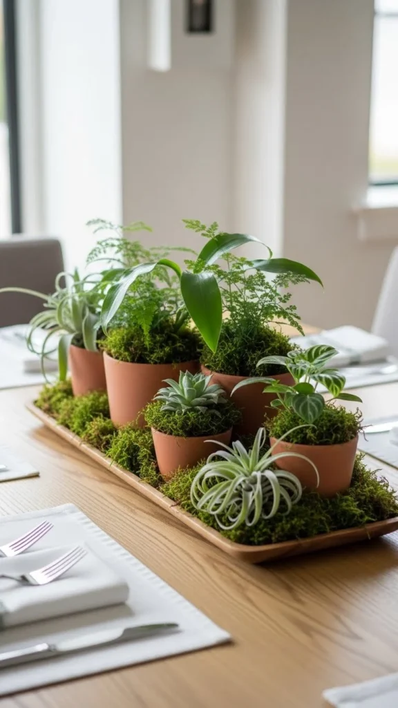 Plants make long-lasting decor. Group small pots or moss trays in the center of the table.