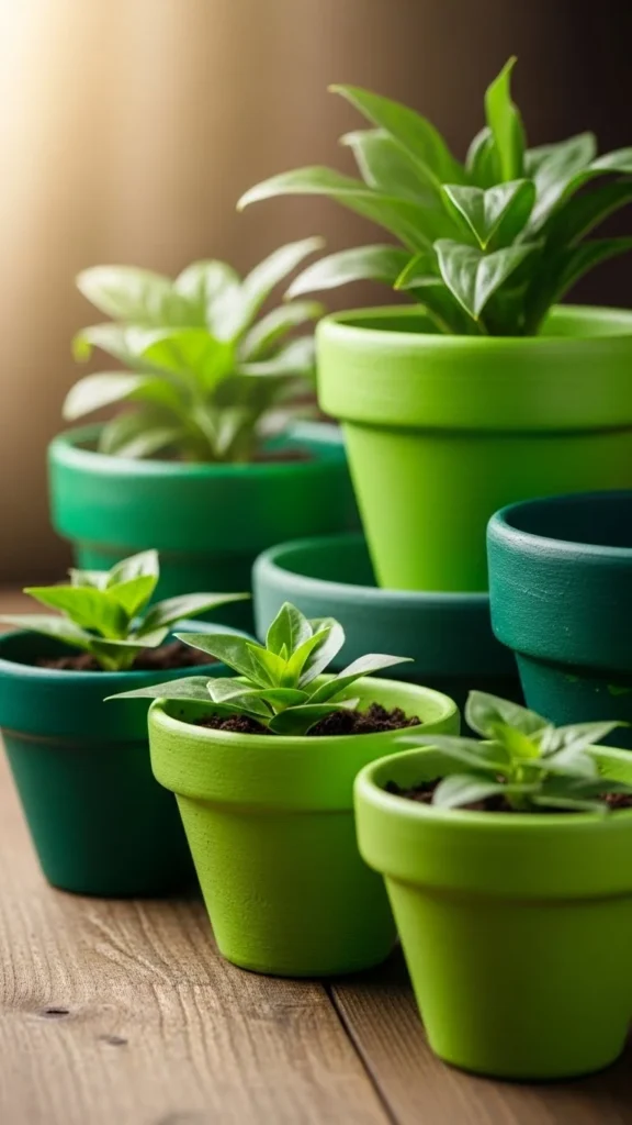 Paint clay pots in soft greens. Use matte finishes.