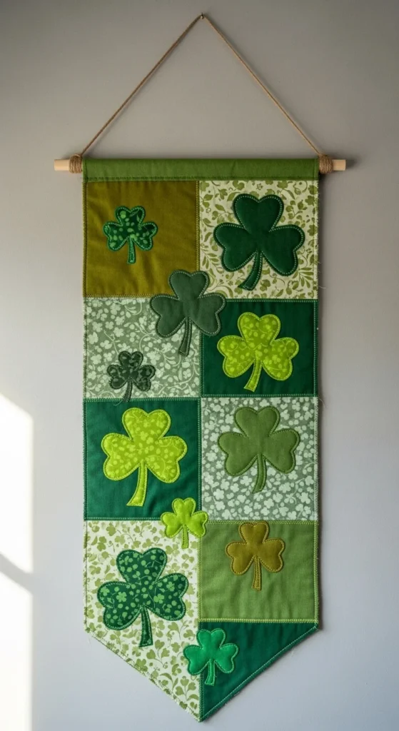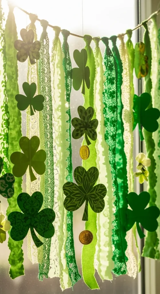 Fabric garlands feel soft and reusable. Cut shamrock shapes from cotton or felt in various green tones. Stitch or glue onto twine.