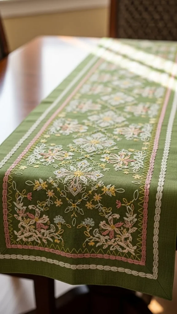 A table runner anchors dining decor. Use cotton or linen fabric in green shades. Simple hand stitching along edges adds detail.