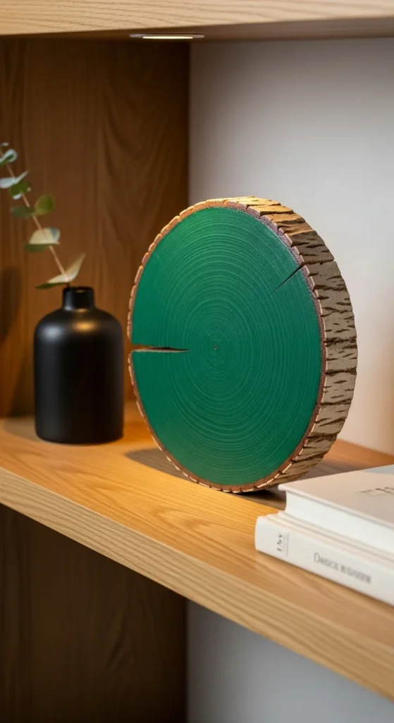 Paint wood slices lightly green. Use as coasters or shelf decor.