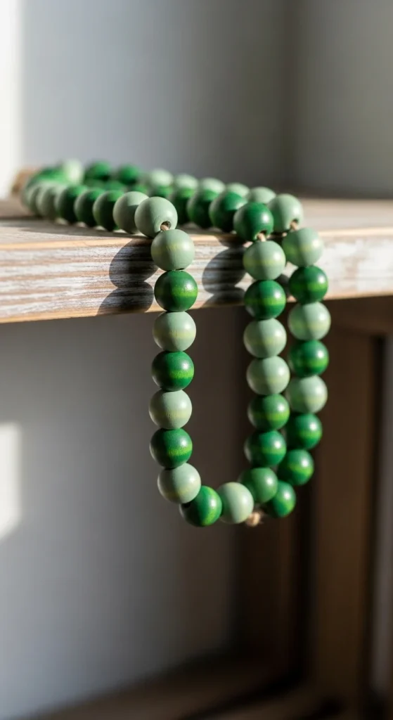 Paint a few wooden beads green and string them with twine. Drape across shelves or trays.