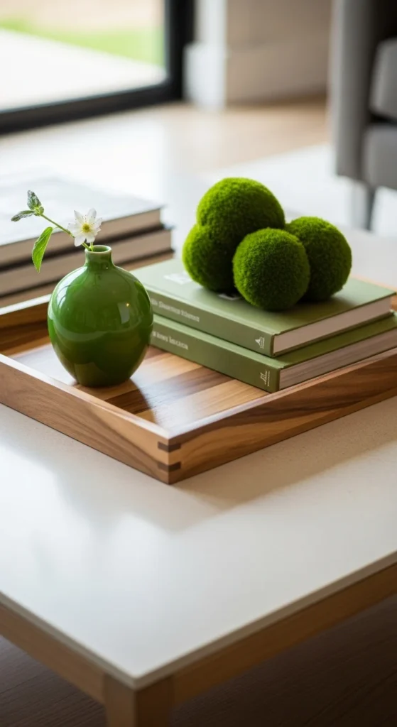 Use a low-profile wood tray to hold green accents. Add a small vase or candle.