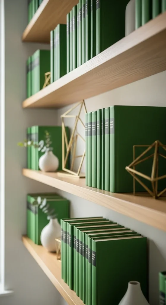 Stack books with green covers or spines. Use them horizontally or vertically.