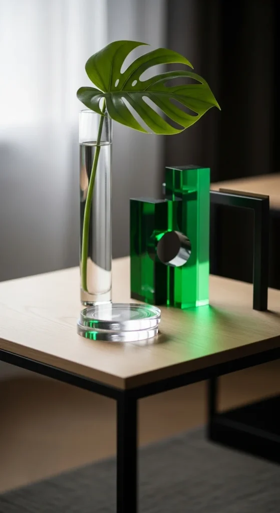 Acrylic decor keeps spaces light. Choose green-tinted pieces for subtle color.