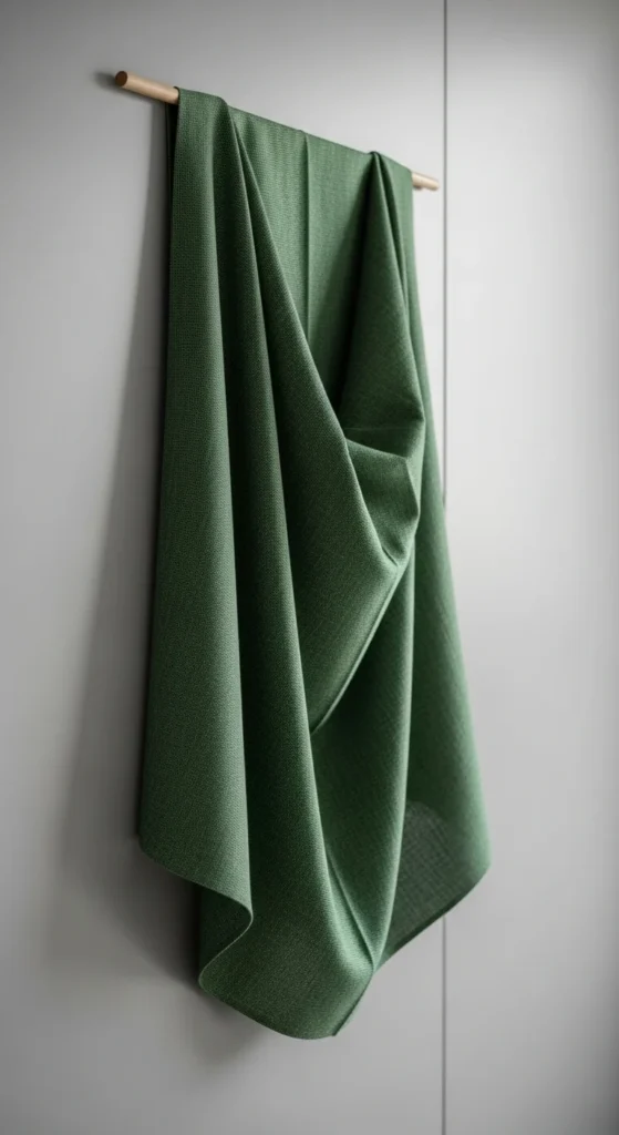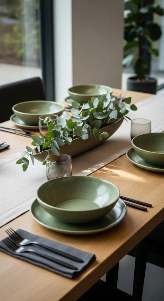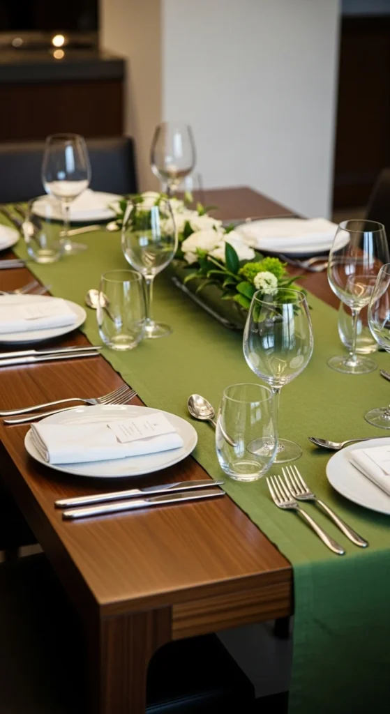 A linen runner in muted green softens a modern dining table. Let it drape naturally for texture.