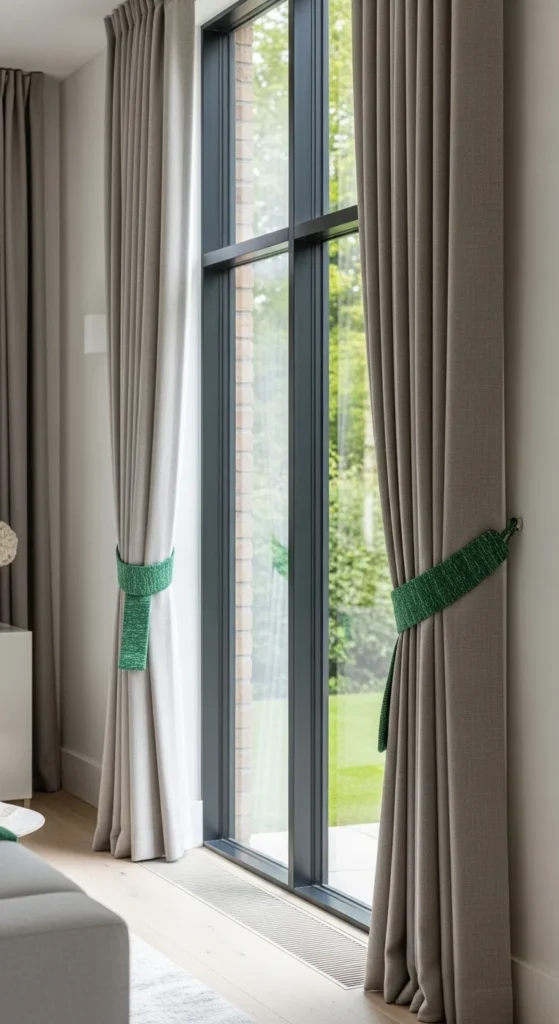 21. Neutral Curtains With Green Tiebacks