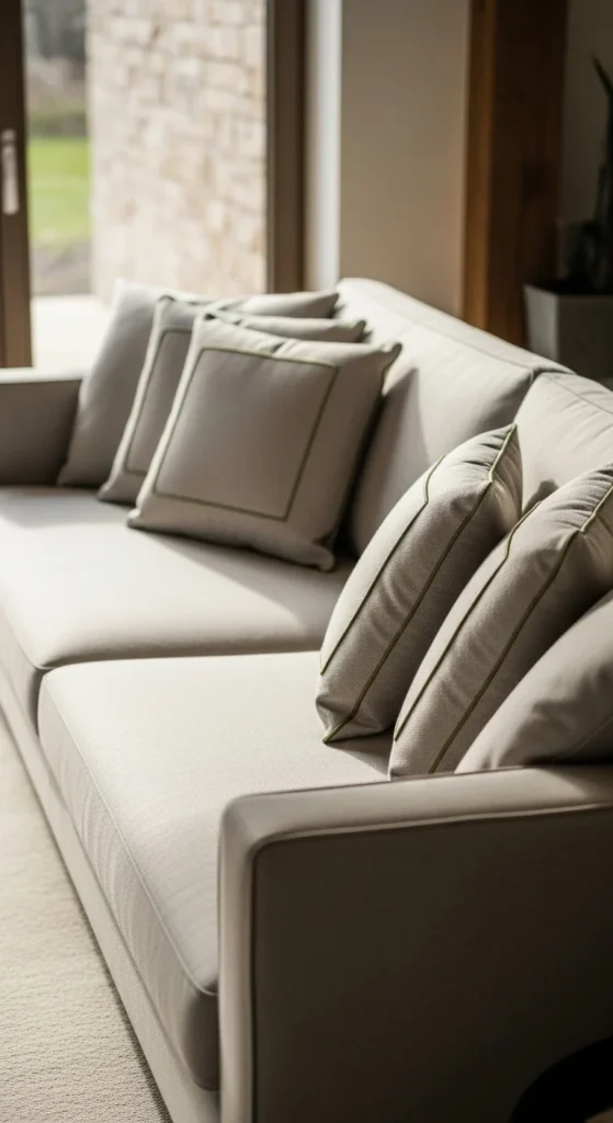 Instead of bold patterns, use pillows with green piping or stitching. This adds color in a controlled way.