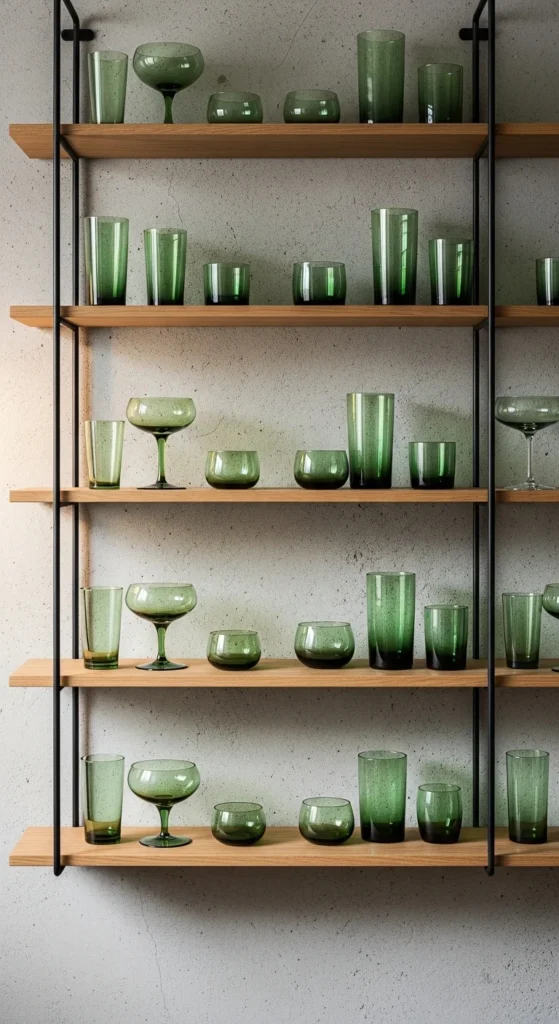 7. Green-Tinted Glassware Display